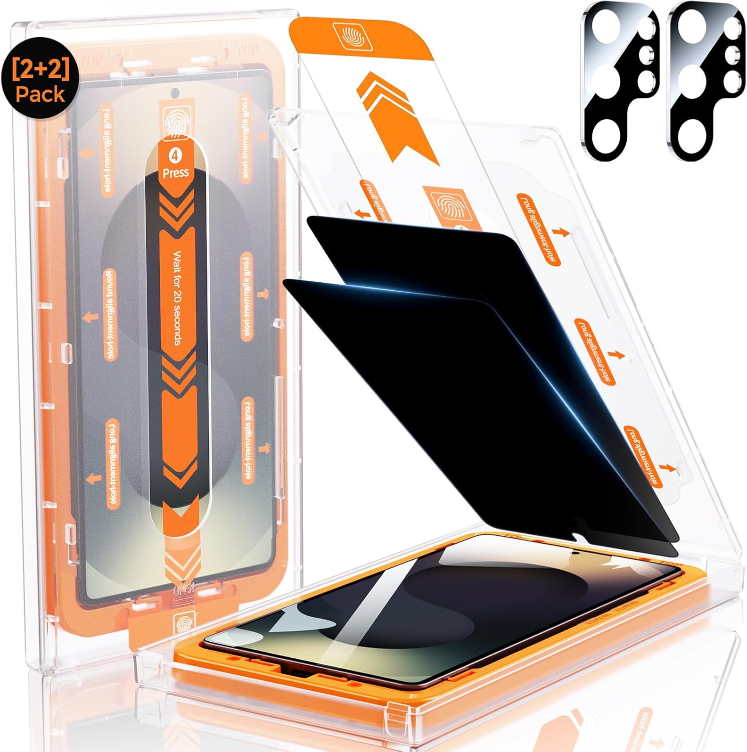 - [1:1 Coverage, Strong Anti-Fingerprint 100% Bare Screen] This Privacy screen protector mimics Samsung Galaxy S25 Ultra 1:1 precision molding, featuring enhanced 3D curved edges, full-coverage design, dustproof and non-invasive, and is compatible with most phone cases on the market. The enhanced hydrophobic and oleophobic coating reduces the adhesion rate of fingerprints, oil and dust by 95%, keeping it smooth and non-greasy even after prolonged use, providing a truly flawless touchscreen experience.