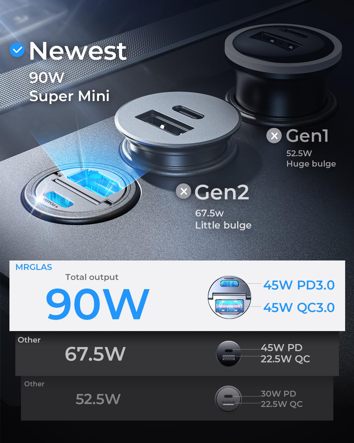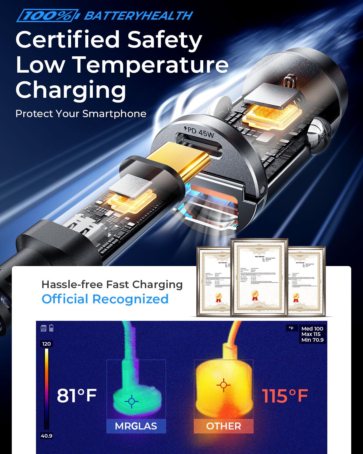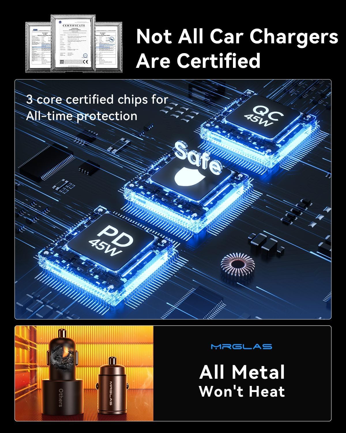 - EXCELLENT HEAT DISSIPATION AND SAFETY: Compared with common plastic, the MRGLAS 90W car charger is made of all metal, which provides better heat dissipation, scratch resistance and beautiful design.MRGLAS USB c car charger passes multiple safety certificates and has built-in dual-core PD45W&QC45W intelligent identification chip, which prevents overcurrent, short circuit, overvoltage, undervoltage, overheat and overpower, protect your device from damage