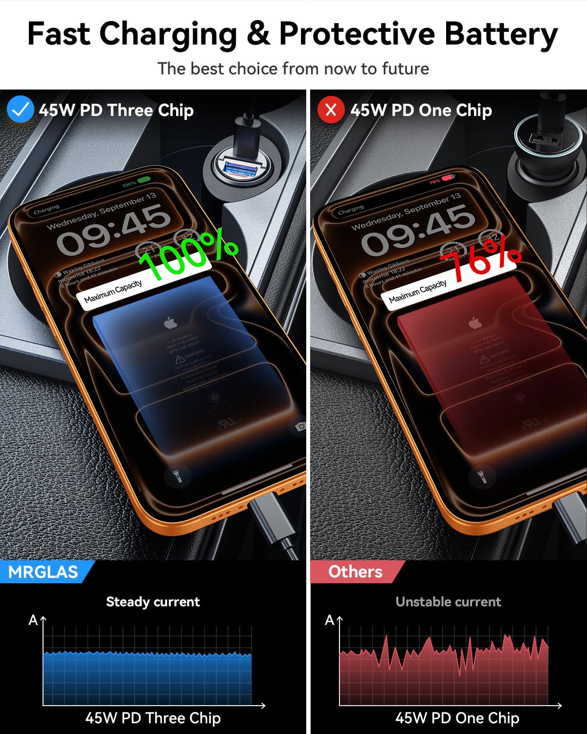 -23%- PD45W+QC45W SUPER FAST CHARGING: MRGLAS 90W car charger adapter fast charging supporting PD 45W(usb-c port) and QC 45W(usb-a port) high output, Can fast charge all prevailing phones/iPad/tablet at the same time. Makes the IPhone 16 Pro Max and Samsung Galaxy S25 charging time from 0% to 89% in 30 minutes