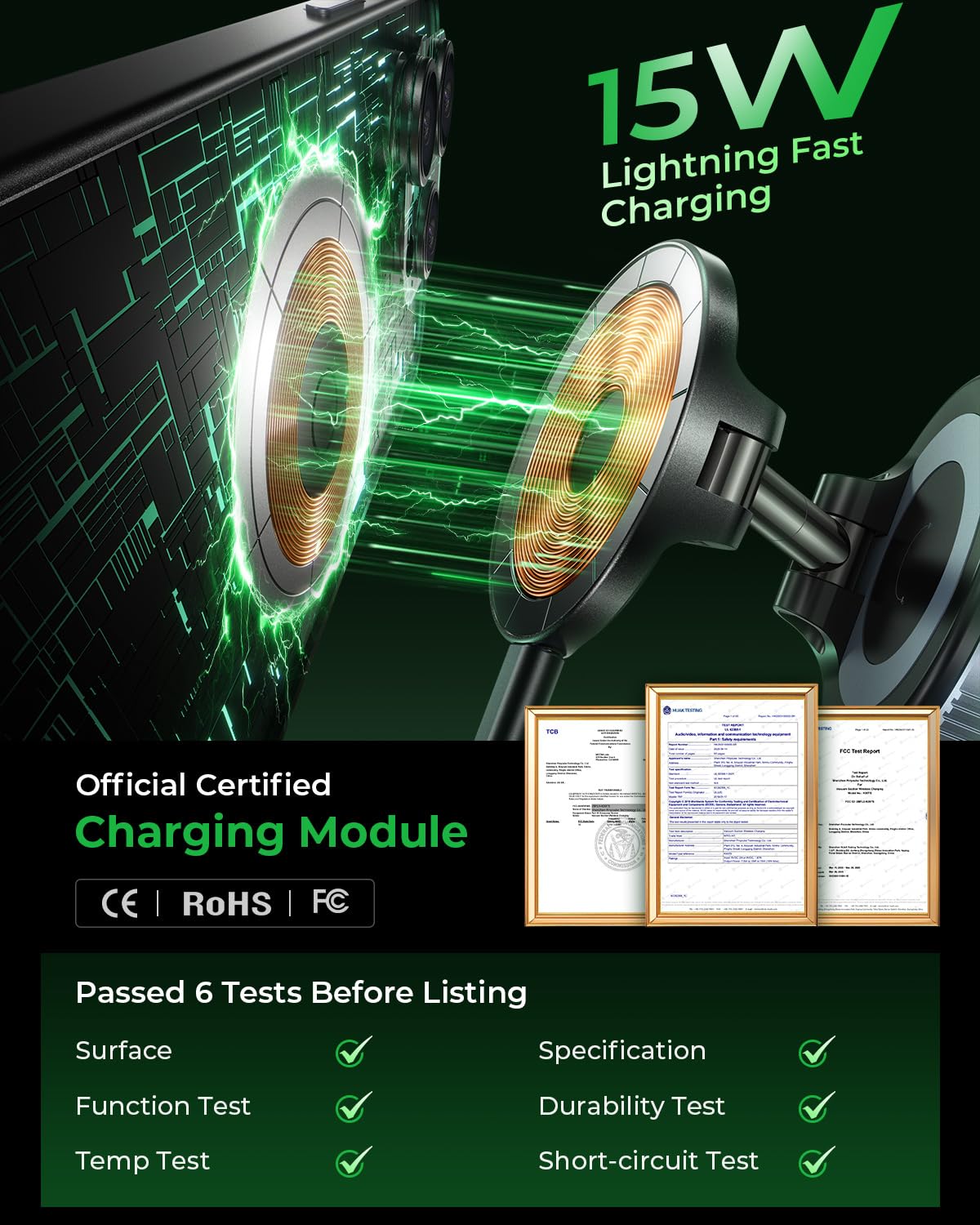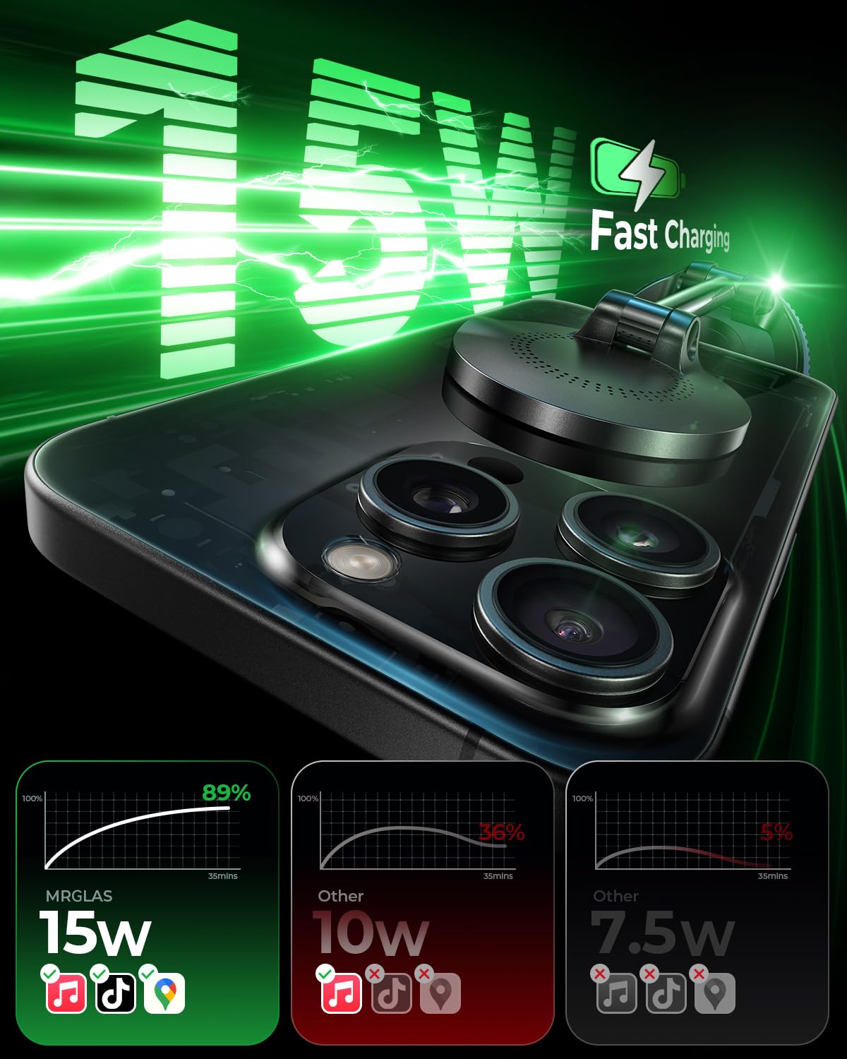 - [15W Turbo Wireless Charging]: Get a rush-free commute with MRGLAS’s 2025 Magsafe car mount charger. Its reinforced copper coil and smart cooling vents deliver up to 80% charge in just 1 hour for iPhones (lab-tested under optimal conditions). The advanced cooling system ensures a stable 15W Turbo charge while preventing overheating. Note: Requires Qi-certified devices. Charging speeds vary; iPhone results based on controlled testing. Only fast wireless charging for iPhone.