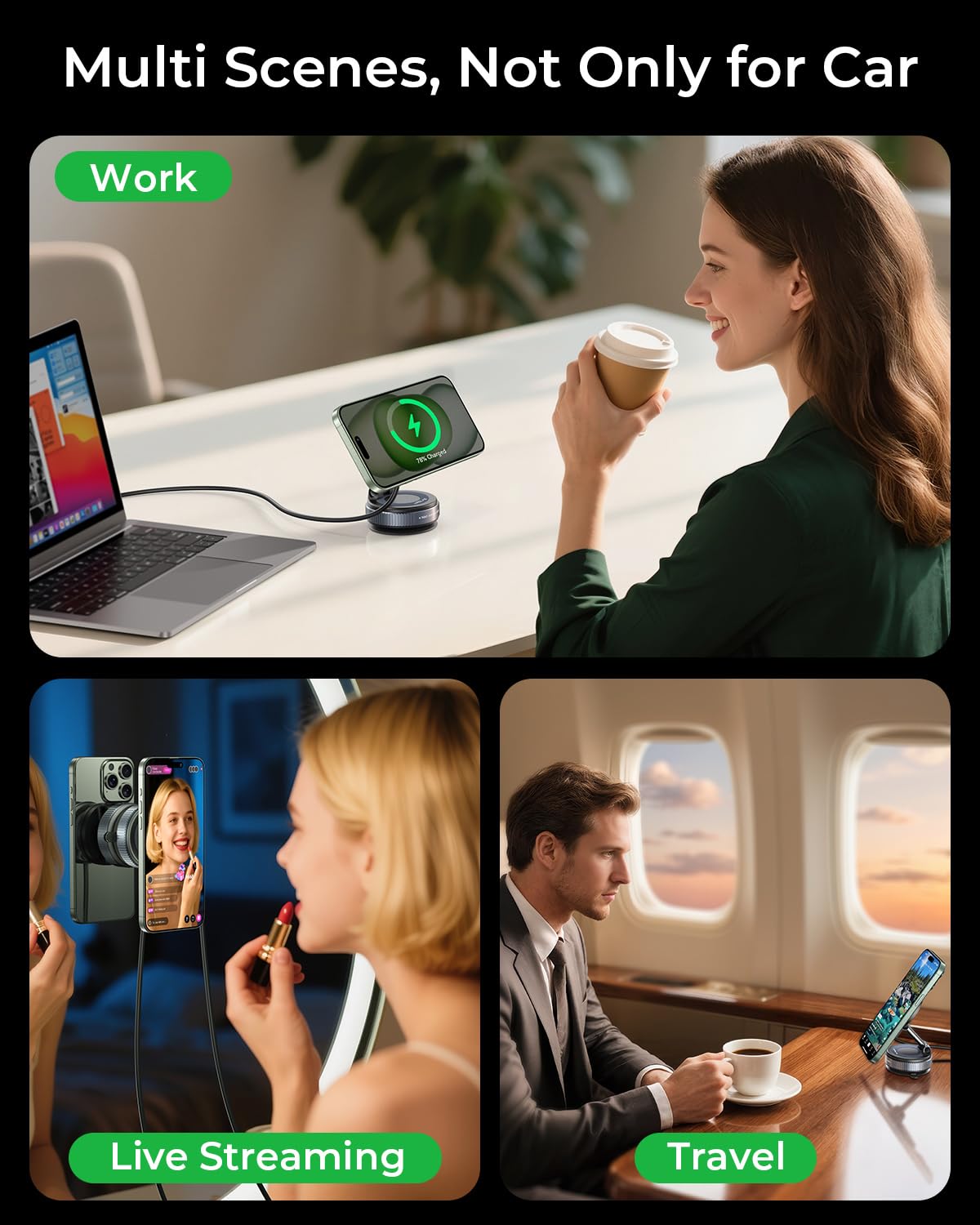 - [Broad Compatibility & Quick Installation]: Designed for iPhone 16/15/14/13/12 series and all MagSafe-compatible devices, this mount includes a magnetic ring to ensure a strong magnetic hold for non-MagSafe phones as well. Whether your phone is bare or in a case, it attaches in just one second with one hand—quick, easy, and hassle-free. With its broad compatibility, it fits securely in virtually any vehicle model, making installation effortless. Just snap it on, and you’re ready to go!