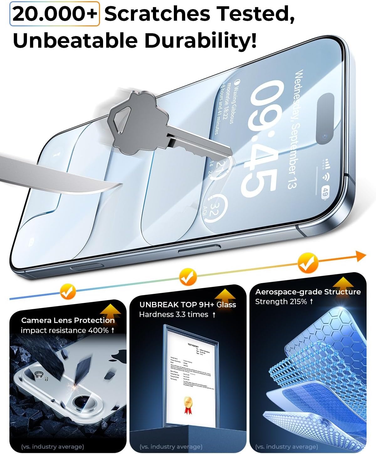- 【Industry NO.1 Military-Grade Shatterproof】Authorized by the international Military Standard with 50+ rigorous engineering tests of 220 lbs impact, 8,000+ drop tests, 10,000+ scratch tests, etc., its strength, toughness and durability perform NO.1 among all glass. By especially breaking the industry’s record with a 12-foot drop, the screen protector for iPhone Air is ensured to be unbreakable from its surface to every edge and corner.